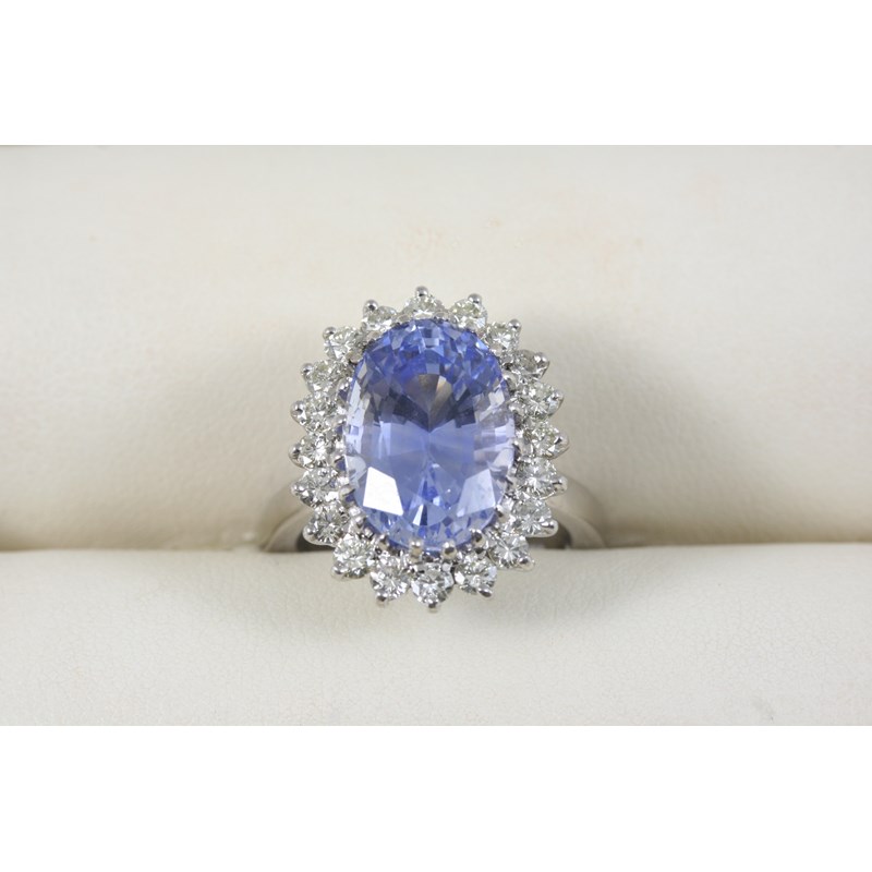 the oval-shaped sapphire is set within a surround of circular-cut diamonds, in 18ct. white gold, signed to the innner shank. Size K.