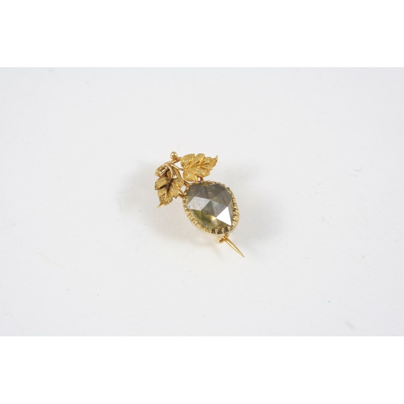 the fancy coloured foil backed diamond weighs approximately 2.50 carats, in gold closed back setting, with gold leaf surmount, 2.5cm. long.