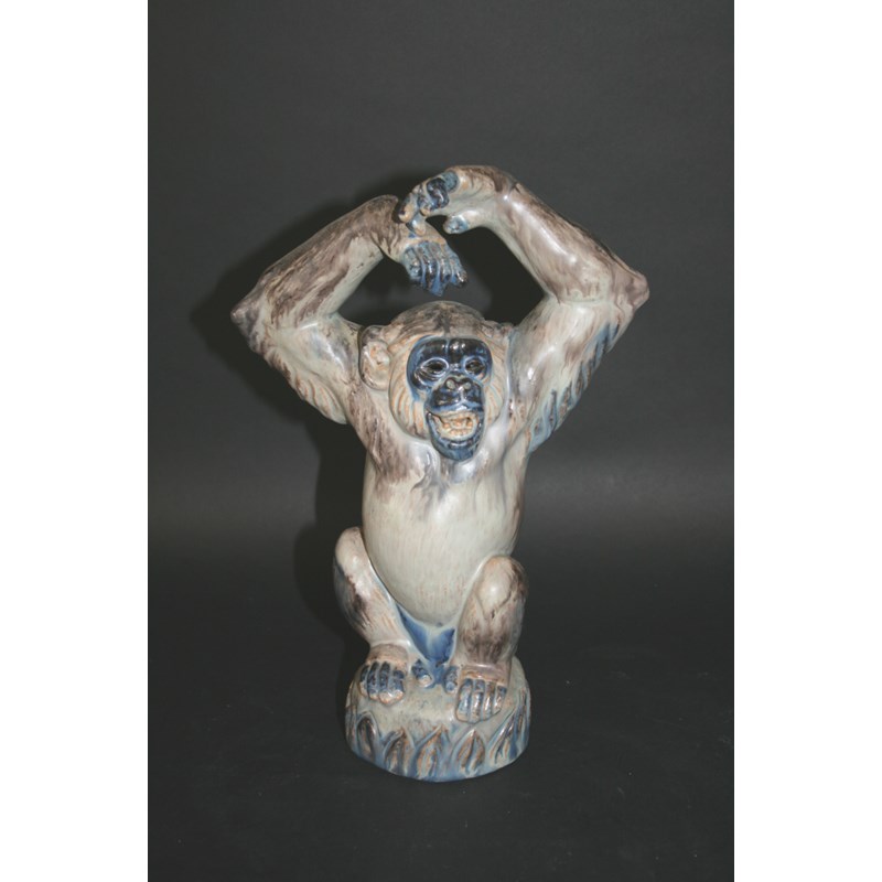 a pottery figure of a Monkey with arms stretched above it's head. Also with two Royal Copenhagen Lizard Dishes, and a Royal Copenhagen Mouse 2644. Monkey marked, Ingdam, Denmark. 11ins (28cms) high. (4)