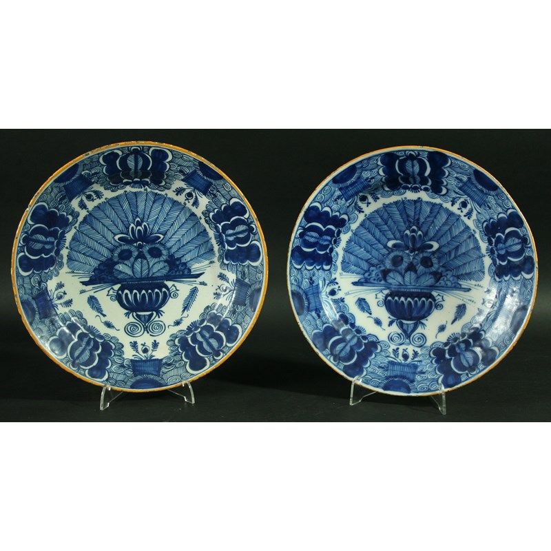 A PAIR OF DUTCH DELFT CHARGERS, later 18th century, painted with feathers and flowers in a vase inside a stylised floral border with yellow rim, pseudo Chinese marks, 26cm (2)