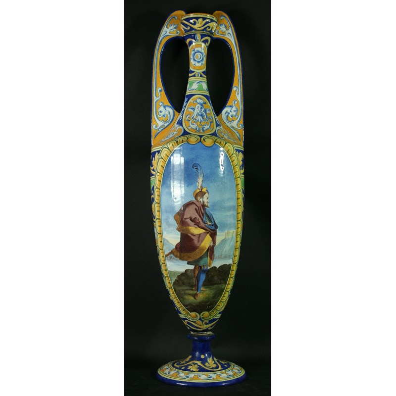 AN ITALIAN MAIOLICA VASE, late 19th/early 20th century, of two handled amphora form, painted with a figure before a castle, on a socle base, impressed marks, 69cm