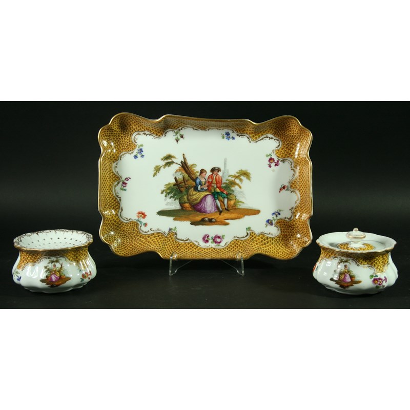 A MEISSEN STYLE DESK TRAY decorated with a courting couple inside a gold fish scale ground. Together with an inkwell and cover and a pounce pot. Some with blue crossed swords marks (3). Tray 29cm.