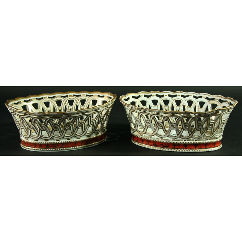 A PAIR OF PARIS PORCELAIN BASKETS mid-19th Century with pierced decoration above a painted band of cherubs playing and hot air balloons. Blue painted 'A' to base, diameter 23cm.
