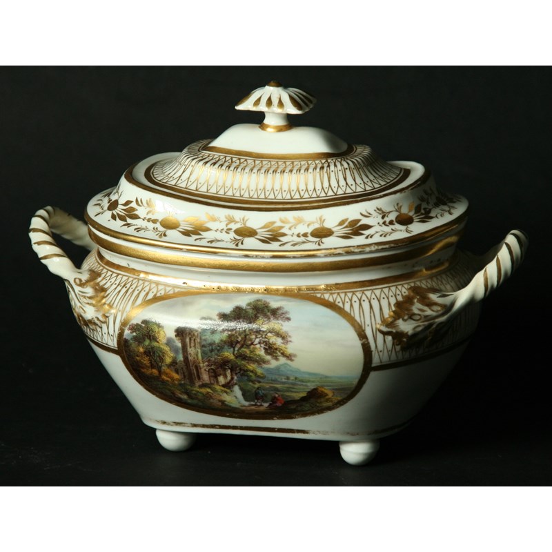 A DERBY TWO HANDLED SUCRIER AND COVER c. 1830, painted with views 'In Italy' and 'In Germany'. Iron red marks to base, 18.5cm.