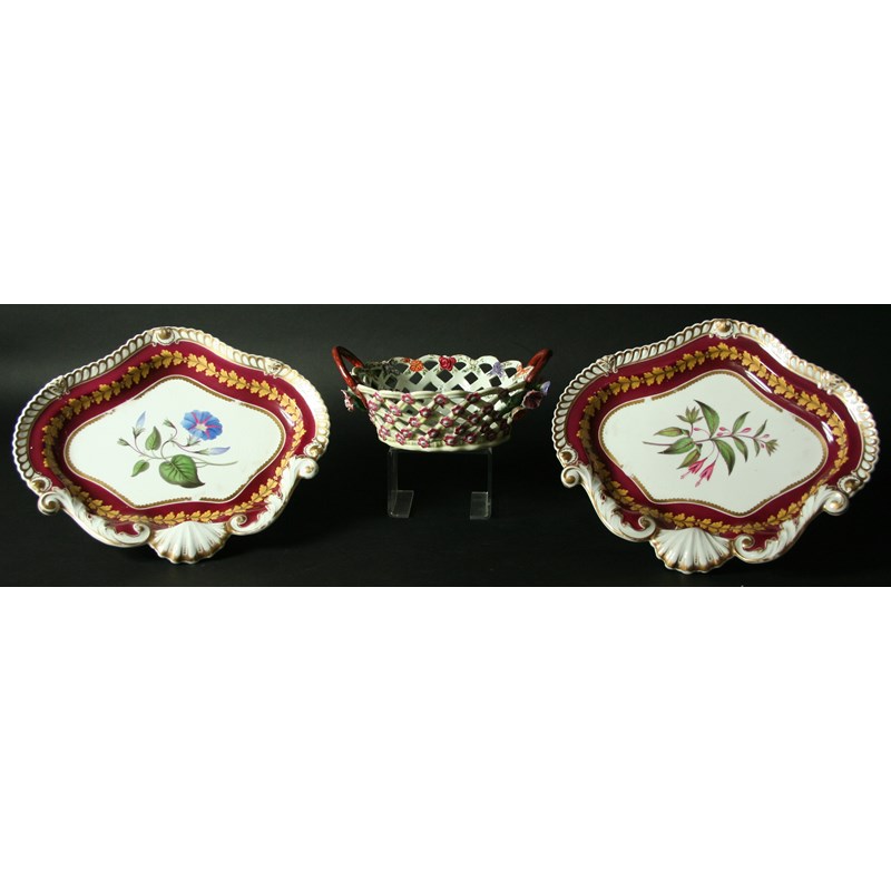 central floral specimen inside a burgundy and gilt rim, iron red painted marks and titled to base. 26cm. Together with an 18th Century English porcelain nut basket (3).