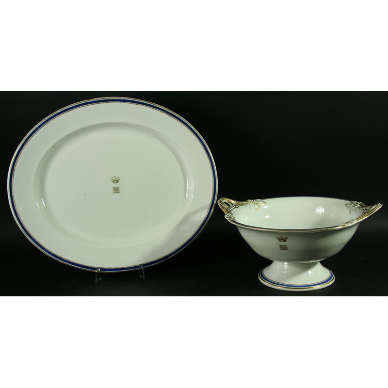 mainly early 20th century, decorated with a central Raglan Crest inside a blue and gilt border, comprising soup, vegetable and sauce tureens and covers, platters and plates in various sizes, puce printed marks (parcel)