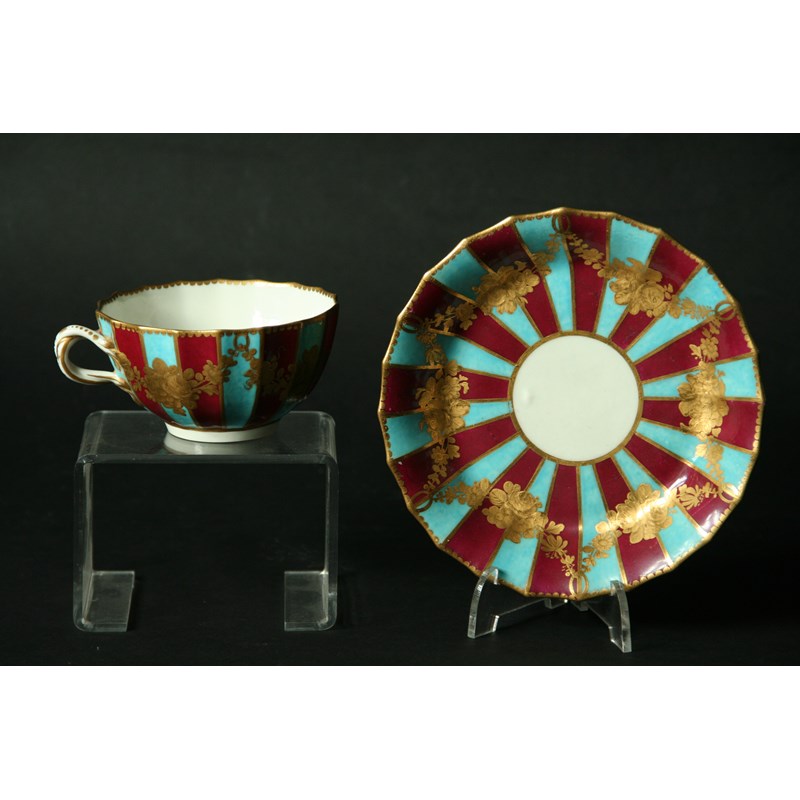 c. 1770, decorated with alternate turquoise and claret stripes with tooled gilt floral swags. Acanthus handle, blue square fret marks to base. Ref: Spero & Sandon 'The Zorensky Collection', p.507.