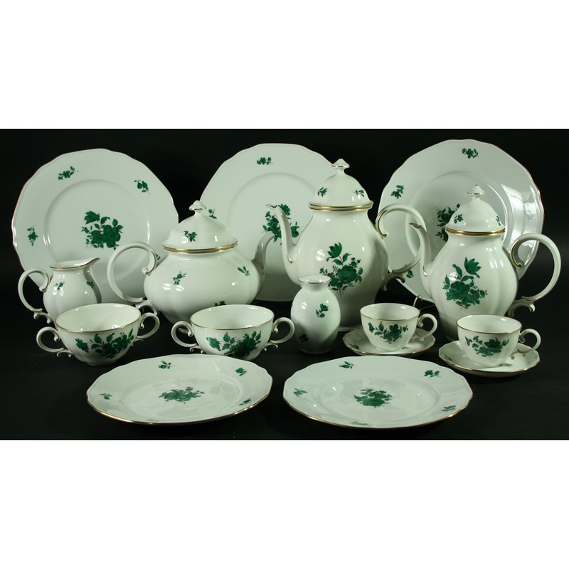 AN AUGARTEN, WIEN, GREEN ROSE SERVICE, 20th Century, comprising a dinner, tea and coffee service including tea and coffee pots, vegetable dishes, sauce boats and candlesticks, printed and painted marks (parcel)