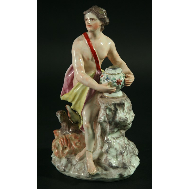 18th century, possibly Bow, allegorical of Winter, a maiden standing next to an urn, a phoenix at her feet, on a rocky base, 20cm; together with an 18th century English Wine Glass, the bell shaped bowl on a white enamel double helix stem, 15.5cm (2)