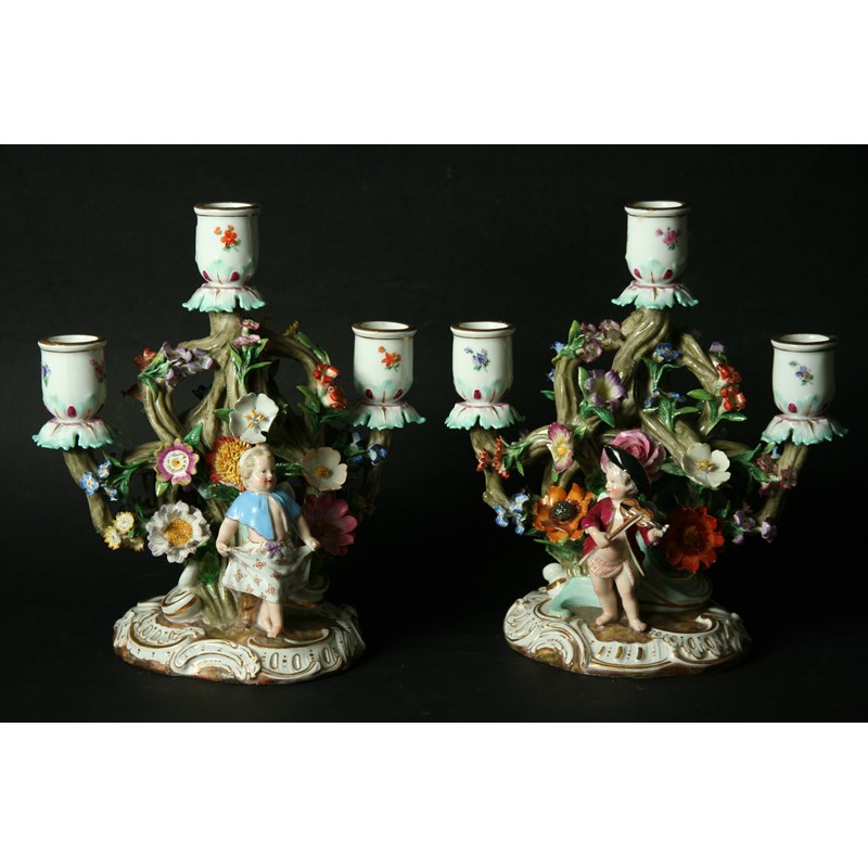 A PAIR OF MEISSEN THREE-LIGHT CANDELABRA late 19th Century, modelled as children before floral encrusted branches. Incised '128' and blue crossed sword marks. Height 21cm (2).