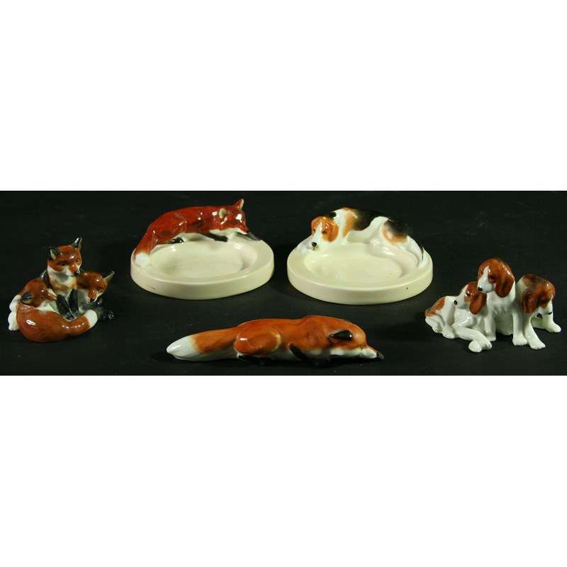 by Doris Lindner, models 2873 and 2873, date ciphers for 1940, puce marks; together with three other groups to include fox, model 3570, fox cubs, 3131, and hound puppies, 3132, printed marks (5)