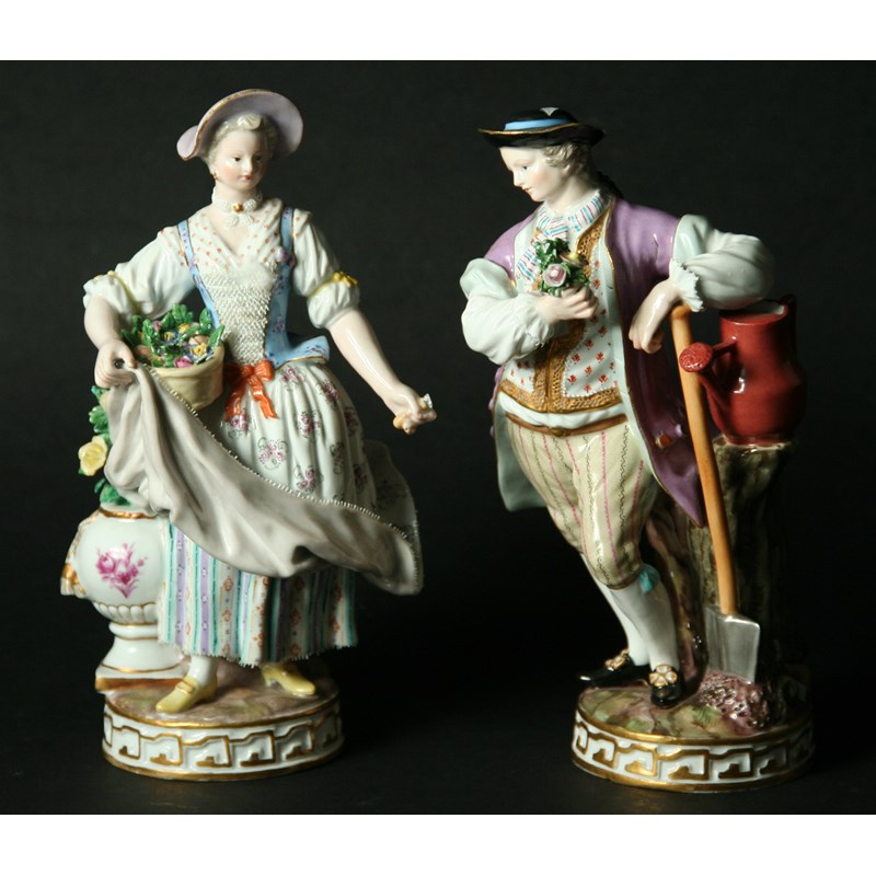 A PAIR OF MEISSEN GARDENER FIGURES incised '668' with blue crossed sword marks. Height 18.5cm (2).
