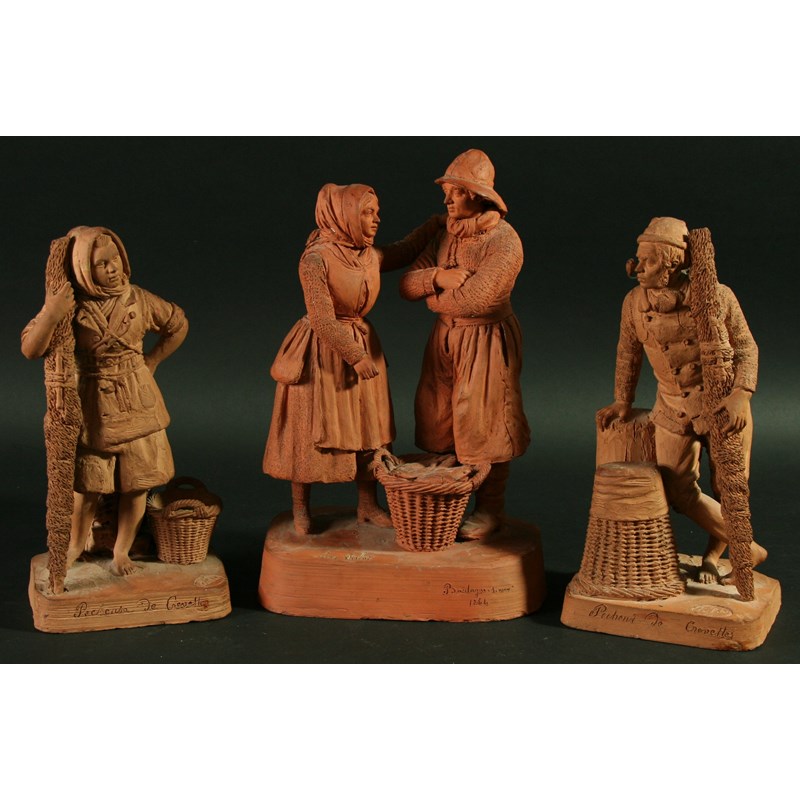 a terracotta figure group of a fisherman and wife with a basket of fish, incised signature and 'Boulogne.s. mer 1864, 28cm; together with pair of figures titled 'Pecheur and Pecheuse de Crevettes', impressed and incised marks, 24cm (3)