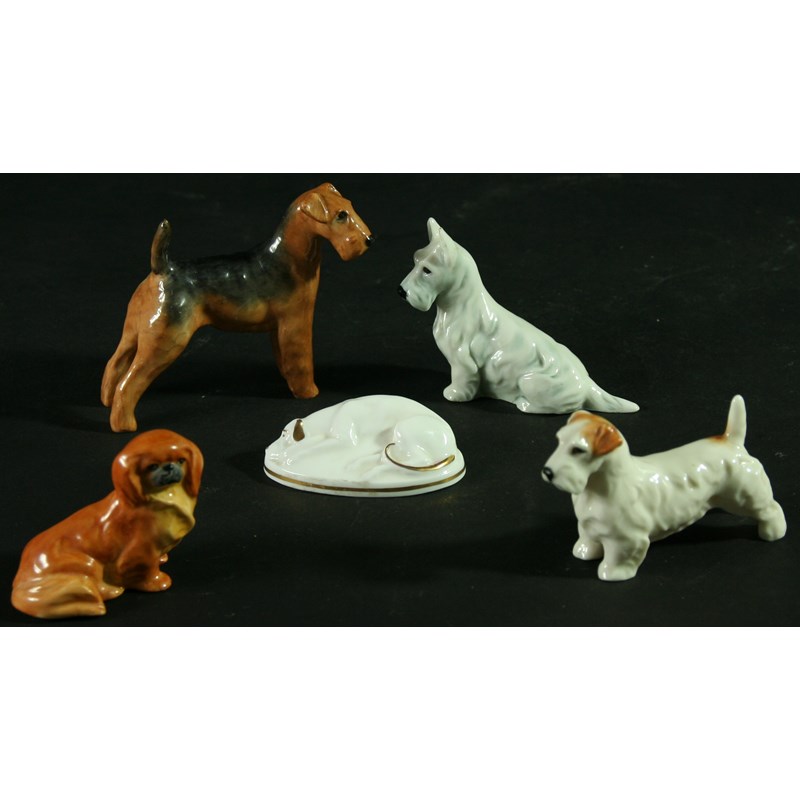 to include Airedale Terrier, 3026, Sealyham Terrier, 3028, Scottie, 3029 and Pekinese, 3034, printed marks; together with Pointer, from the Country Life Series (5)
