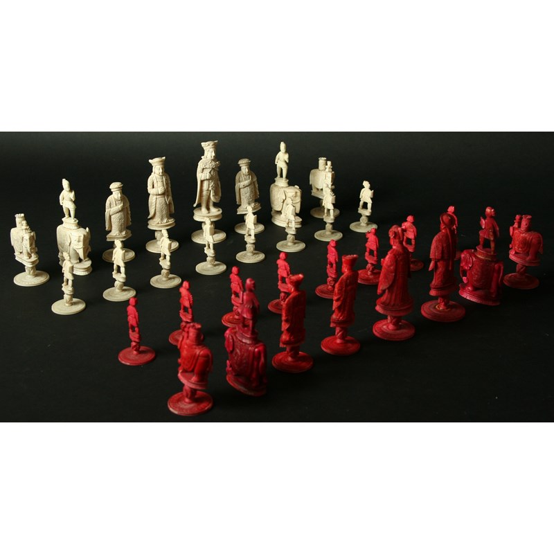A CHINESE RED AND WHITE EAST AND WEST IVORY COMPOSITE CHESS SET white King 4ins. (10cms.) high