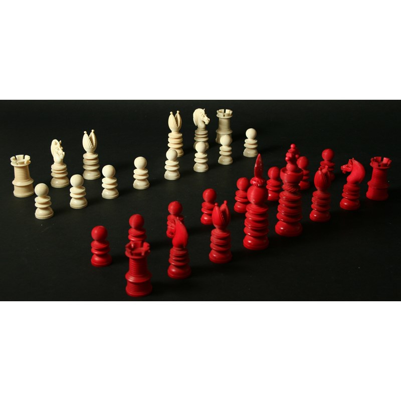 A RED AND WHITE IVORY PART CHESS SET each piece turned, the King 4ins. (10cms.) high