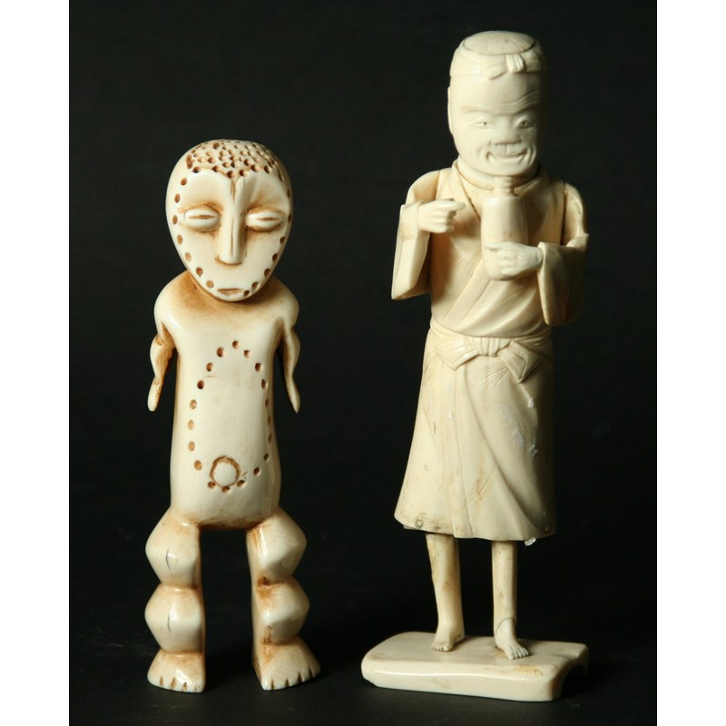 TRIBAL ART: A CARVED IVORY FIGURE, possibly Lega, height 15cm. together with a Japanese sectional okimono (2).