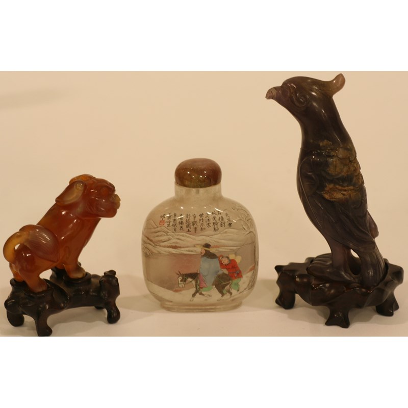 A CHINESE INTERIOR PAINTED SNUFF BOTTLE AND COVER decorated with a winter scene of figures and horses beneath a panel of script. 7.5cm; together with two Chinese stone carvings of a dog and a bird. (3).