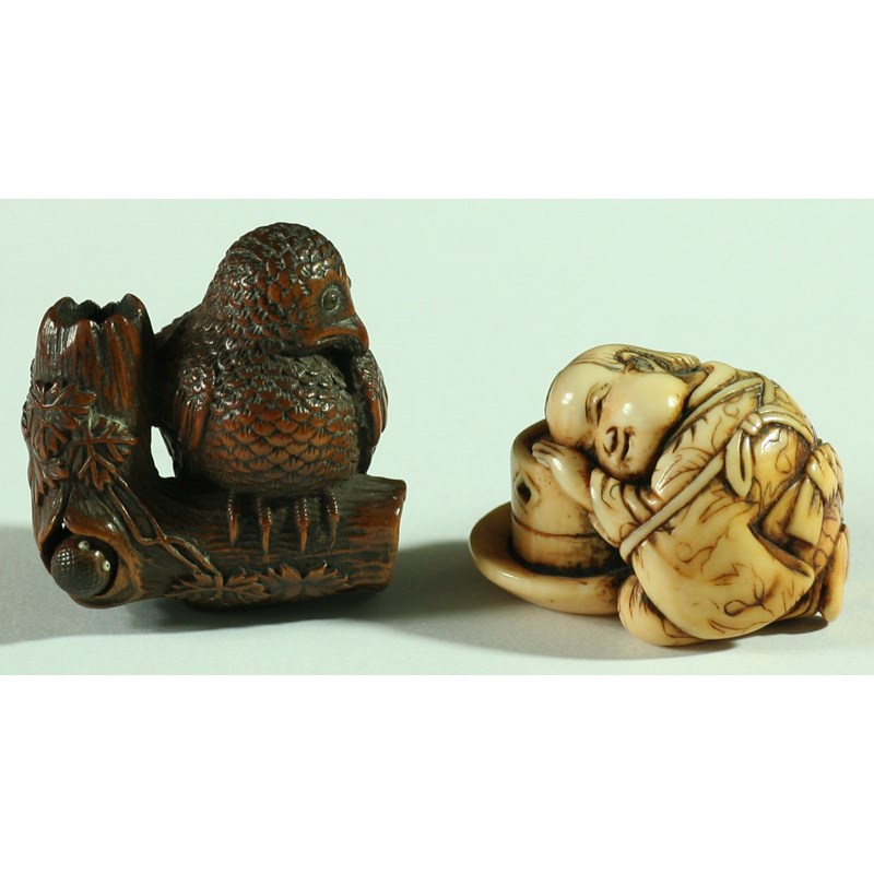 modelled as boy resting his head on a cricket box, 3.5cm; together with wooden netsuke carved as a bird on a branch with its chick in a hole (2)