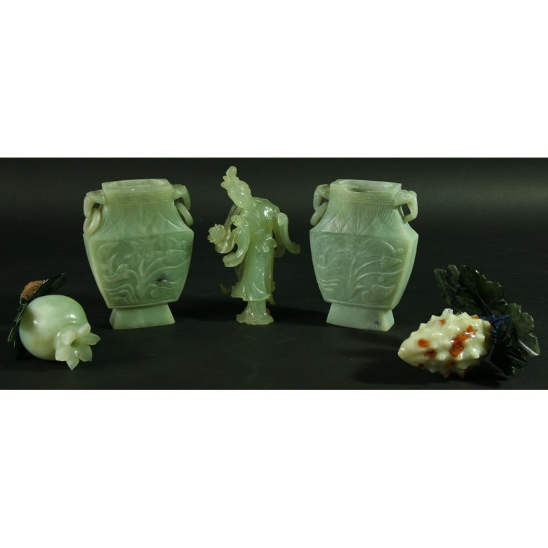 of flattened ovoid form, with floral carving and ring handles, 14cm; together with a figure of Guanyin, and two fruits with leaves (5)