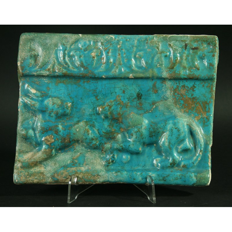 Persian, cast with a cheetah attacking a deer beneath a scrolling frieze in a turquoise glaze, height 17.5m x width 23cm.