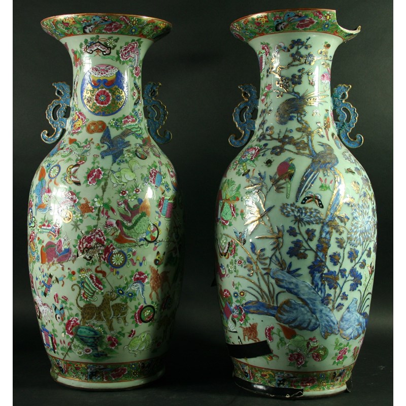 A PAIR OF CHINESE CANTON VASES of two-handled baluster form, famille rose decorated with birds, insects and beasts on a celadon ground, possibly late 18th century, 58cm. (a/f)(2).