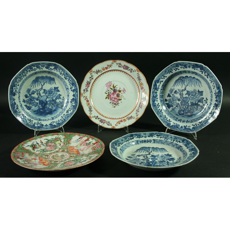 probably late 18th century, painted with a willow tree behind and rock and fence; together with two Chinese enamelled plates with floral and figural decoration, 24.5cm and smaller (7)
