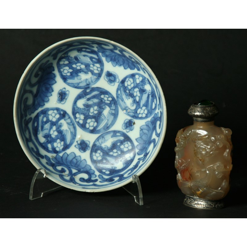 A CHINESE JADE AND SILVER MOUNTED SNUFF BOTTLE carved with animals and insects amongst branches, 9cm; together with a Vungtao saucer dish (2)