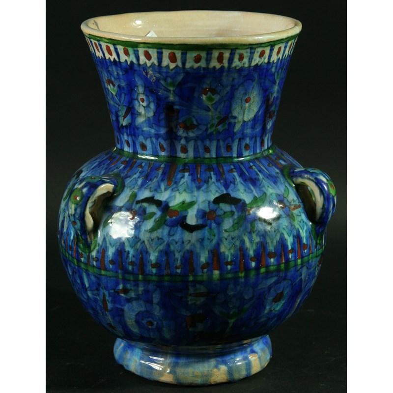 A MIDDLE EASTERN VASE, of baluster form, with three loop handles and stylised floral decoration; together with another of squat shouldered form, printed 'Jerusalem' to base, 26cm and smaller (2)