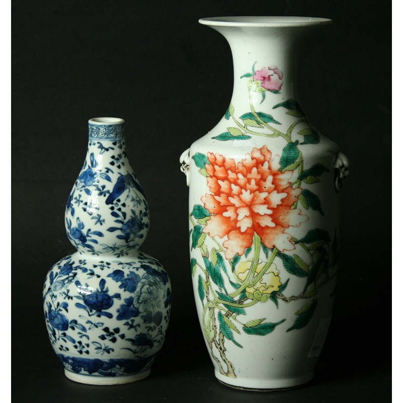 A CHINESE FAMILLE VERTE VASE painted with peonies, 27cm; together with a blue and white double gourd vase, 20cm. (2).