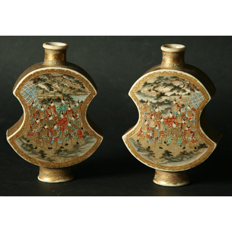 A PAIR OF SATSUMA VASES of waisted cartouche shape, one side painted with samurai, the reverse with maidens, 5" (12.5 cms) high
