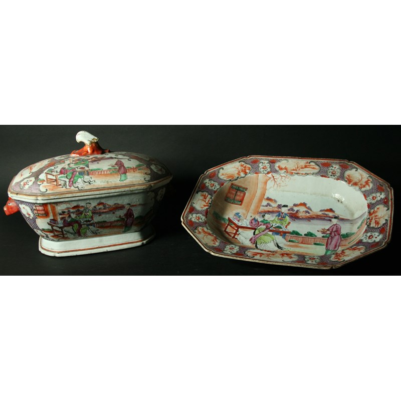 A CHINESE EXPORT TUREEN, COVER AND STAND each piece painted with ladies on riverside terraces, Qianlong, stand 36.5cm
