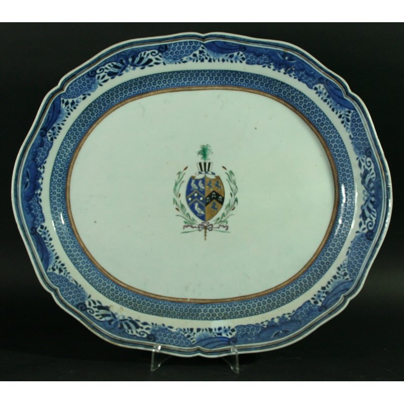 THREE CHINESE EXPORT ARMORIAL PLATTERS en suite to previous lot. 44cm and smaller. (3).