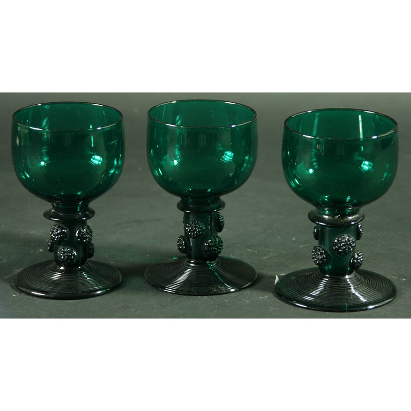 A SET OF EIGHT 'BRISTOL GREEN' ROEMER STYLE WINE GLASSES with hollow stems, raspberry prunts and spreading feet, 10.5cm. (8).