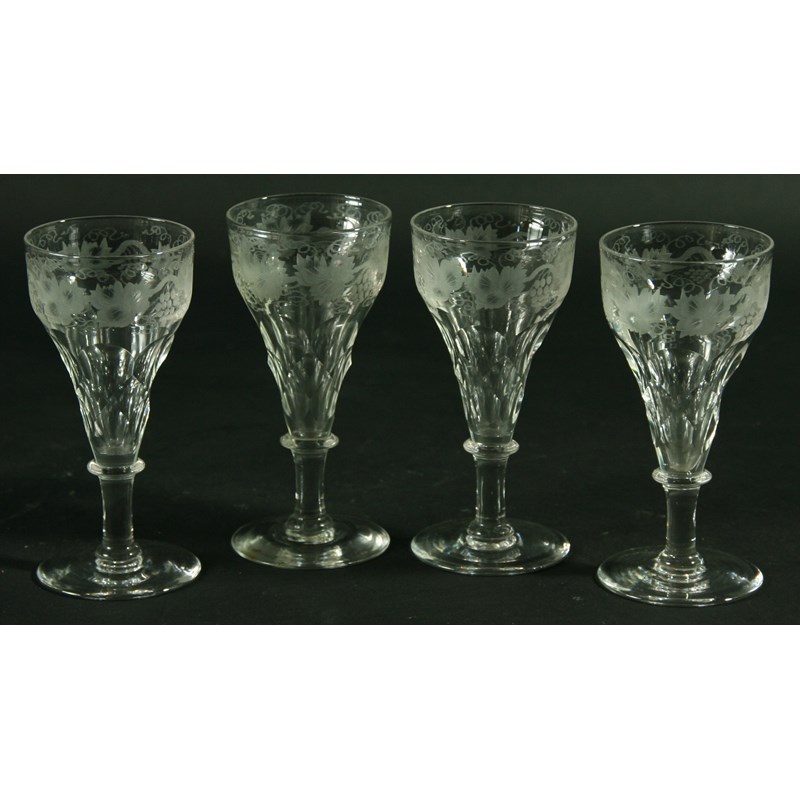 A SET OF SIX WINE GLASSES with engraved fruiting vine decoration above faceting. Together with four moulded glass jelly glasses and a hobnail cut dish (11).