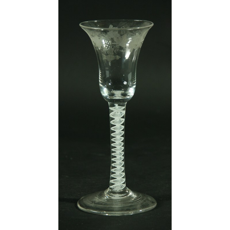 AN EIGHTEENTH CENTURY WINE GLASS, the bell shaped bowl with engraved fruiting vine and bird decoration, above a multistrand, white enamel double helix stem and spreading foot, 17cm
