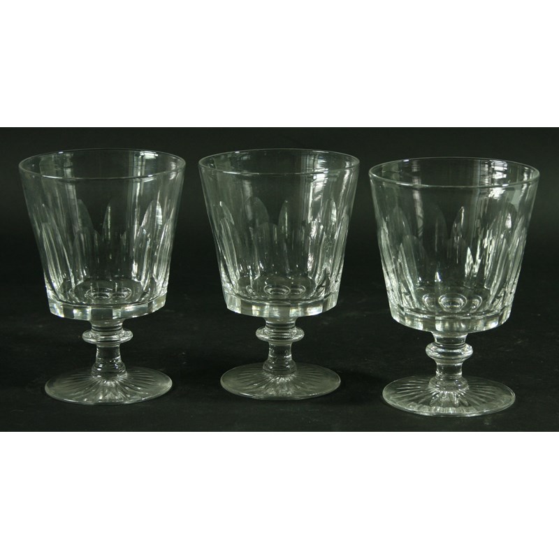 A SET OF SIX VICTORIAN DRINKING GLASSES, the bucket shaped bowls with faceted decoration above knopped stems and cut circular feet, 14cm (6)