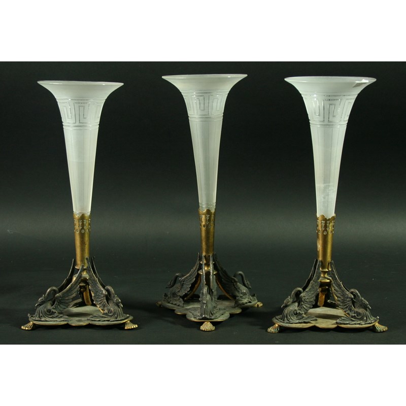 A SET OF THREE TABLE CENTRE PIECES, the frosted glass trumpet vases with Greek Key borders on gilt brass bases with bronze winged peacock head mounts, 27cm (3)