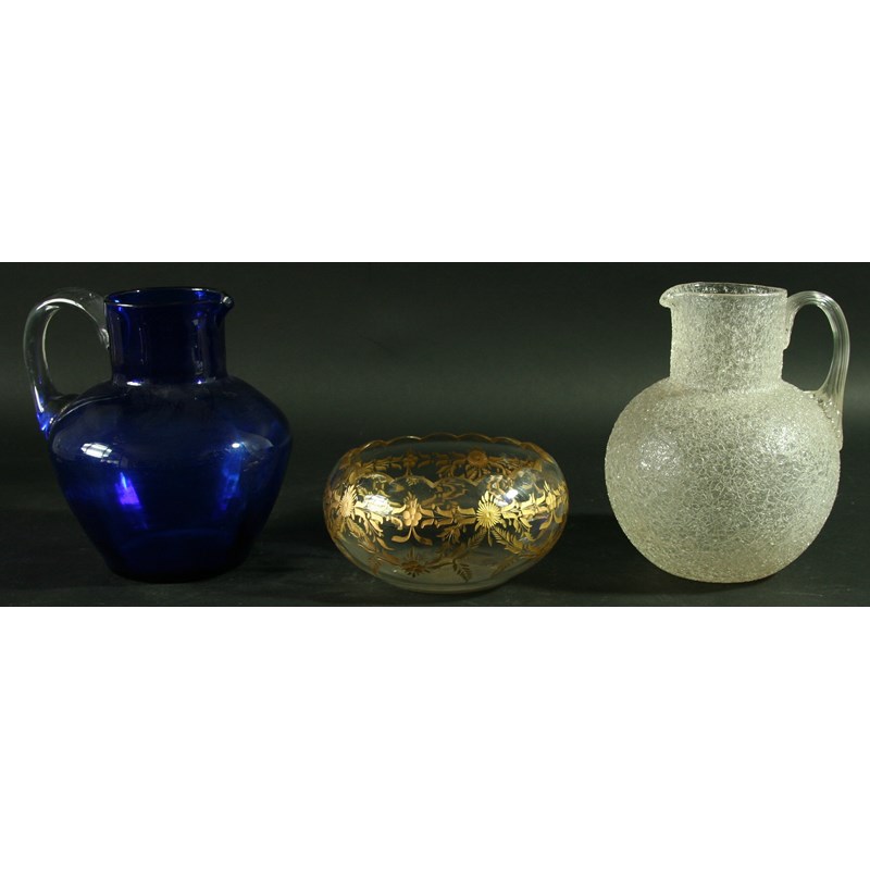 to include two crackle glass jugs and a matching bowl, a 'Bristol' blue jug, engraved and gilt bowl and three other dishes (8)