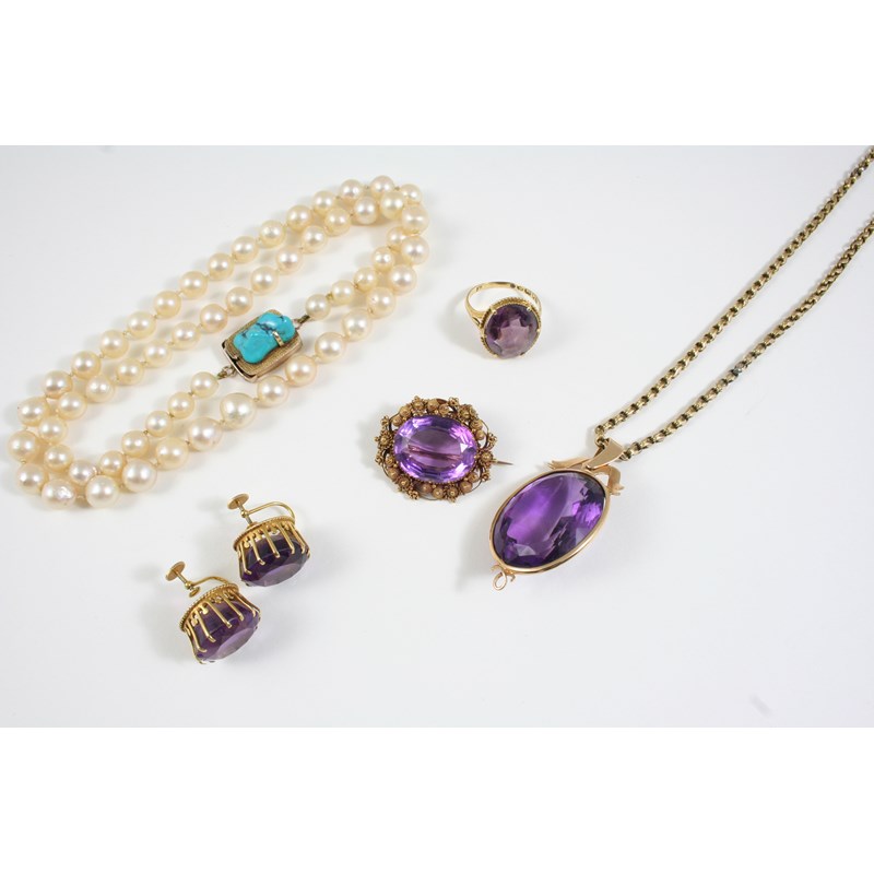 including an oval-shaped amethyst brooch, in a gold cannetille mount, an amethyst and gold pendant, a pair of amethyst earrings, an amethyst single stone ring, set in 18ct. gold, and a single row cultured pearl necklace.