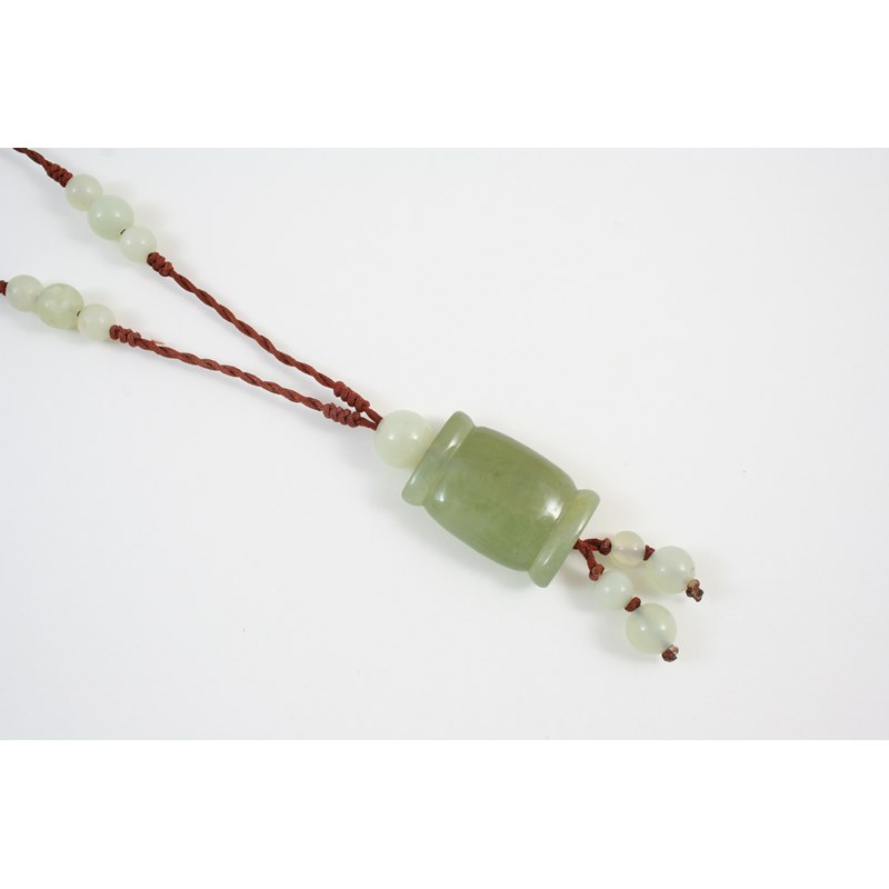 A CHINESE JADE PENDANT formed with a rounded rectangular-shaped section of jade, on silk mounted with graduated jade beads.