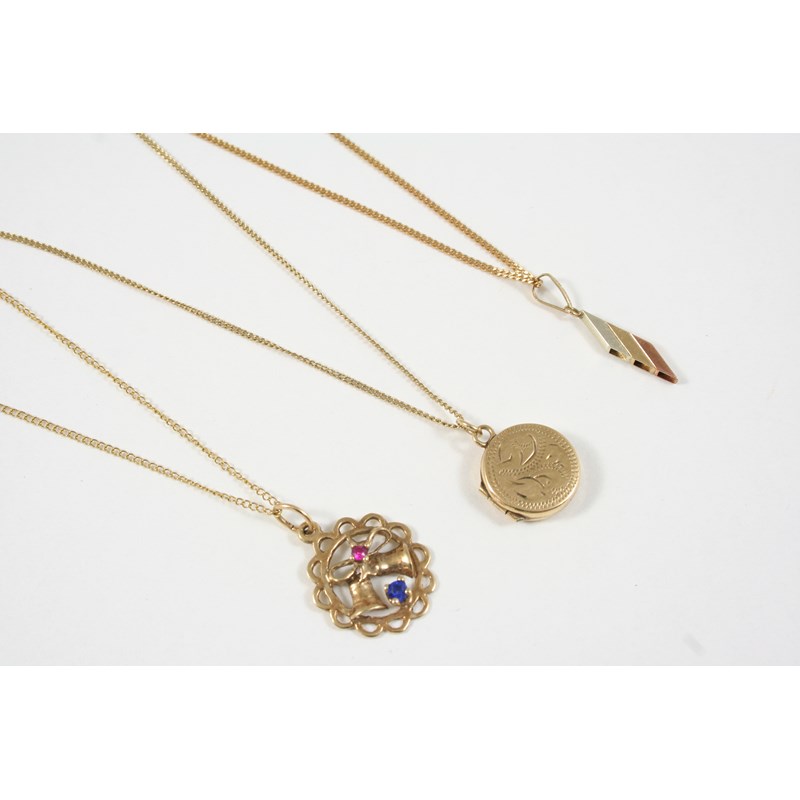 with engraved decoration to the front case, together with two other 9ct. gold pendants, a gold chain and a 9ct. gold tie pin, total weight 14 grams.