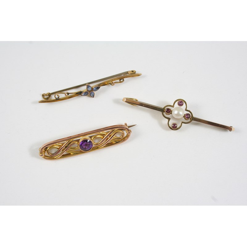 the openwork design is centred with a circular-cut amethyst, 4cm. long, together with a garnet, cultured pearl and gold brooch, 5cm. long, and another gold brooch, 5cm. long.