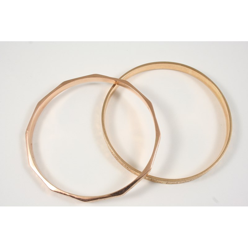 A 9CT. GOLD BANGLE with engraved floral decoration, 7.2 grams, together with a gold plated floral engraved bangle.