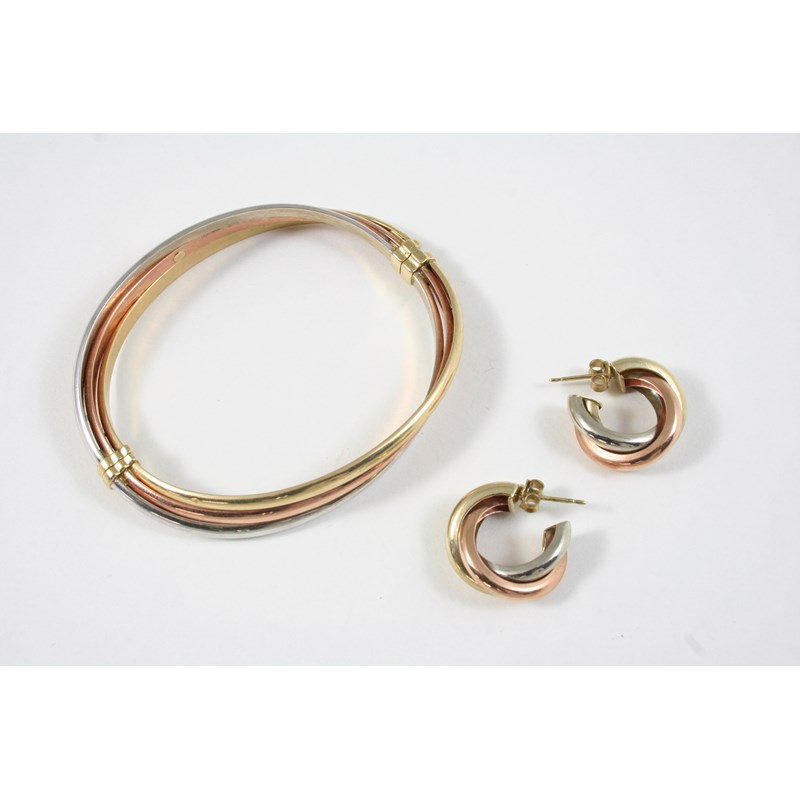 A 9CT. THREE COLOUR GOLD HALF HINGED BANGLE 11 grams, together with a pair of 9ct. three colour gold hoop earrings, 4.3 grams.