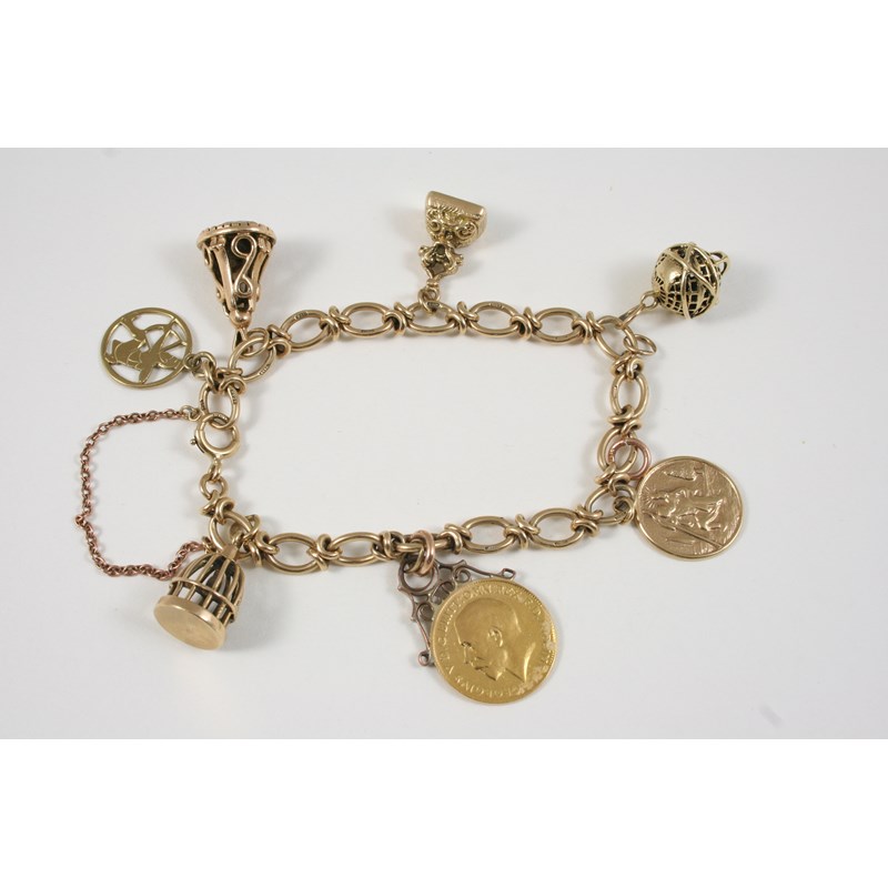A 9CT. GOLD CHARM BRACELET set with assorted charms, 32 grams.