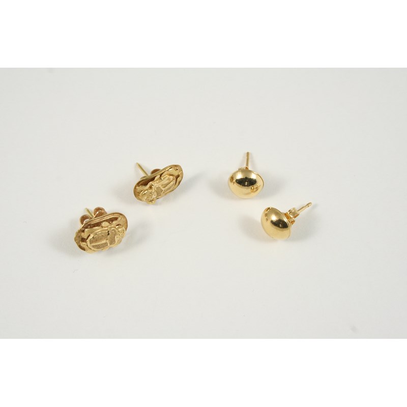 A PAIR OF GOLD SCARAB GOLD STUD EARRINGS 1.5cm., together with a pair of gold circular domed stud earrings, total weight 3.8 grams.