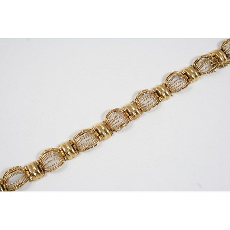 A GOLD FANCY LINK BRACELET with concealed clasp, 17.5cm. long, 16.6 grams.
