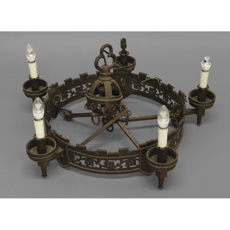 A GOTHIC REVIVAL STYLE IRON CHANDELIER, of circular form with five bronzed sconces, the pierced frame with scrolling leaf decoration, diameter 80cm