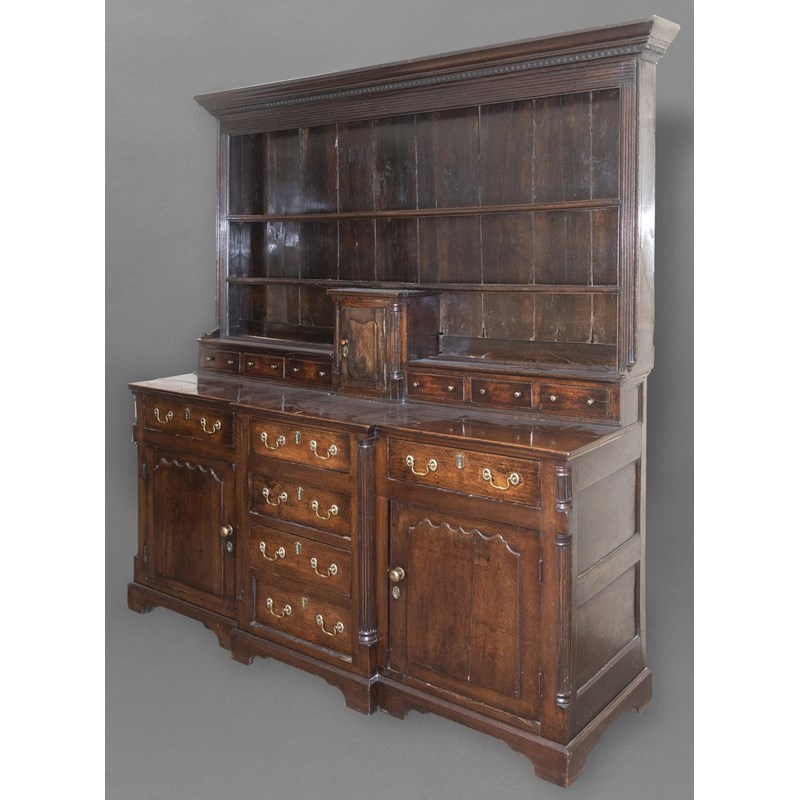 the top with three shelf plate rack above an arrangement of six small drawers flanking a small shelved cupboard, on a breakfront base with a further arrangement of six drawers and two vacant cupboards and fluted column-effect supports, height 212cm, width 198cm, depth 53cm